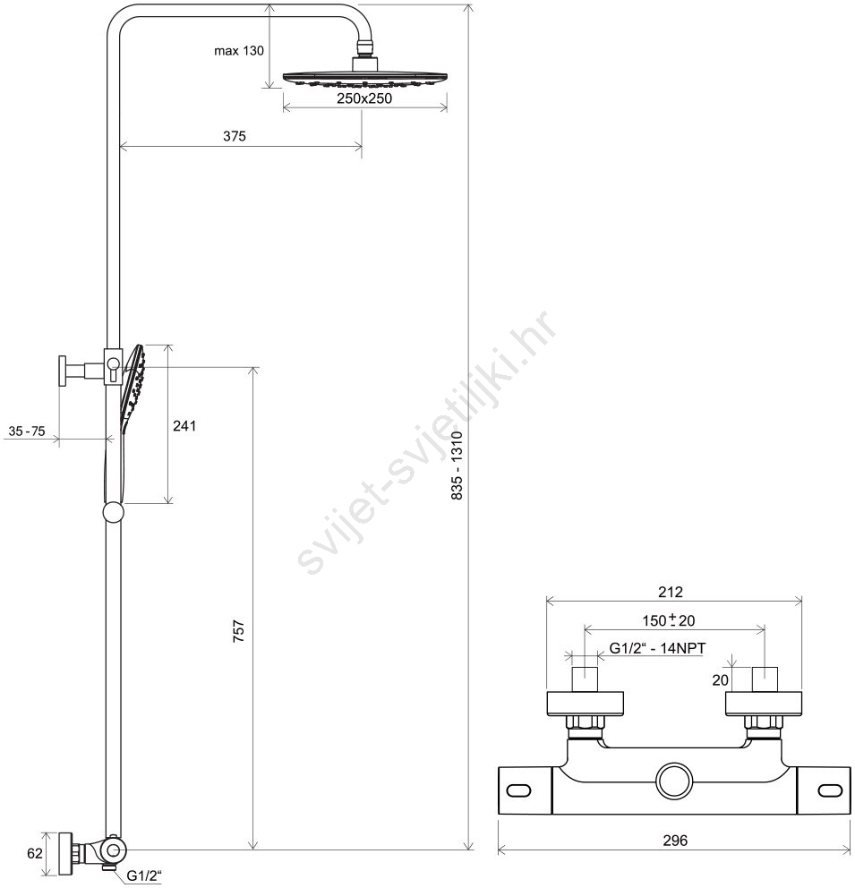 • Visina tuš stupca može se fleksibilno podesiti u rasponu od 84 do 131 cm.