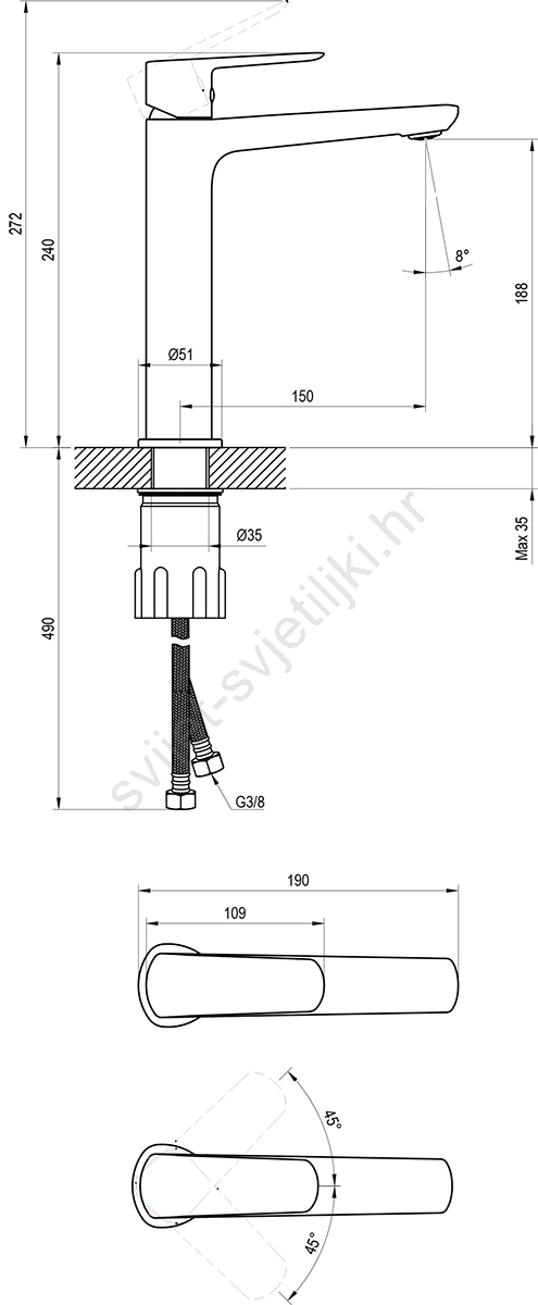 • Baterija se isporučuje bez odtoka i uključuje fleksibilne priključne crijeva duljine 450 mm s navojem G3/8.