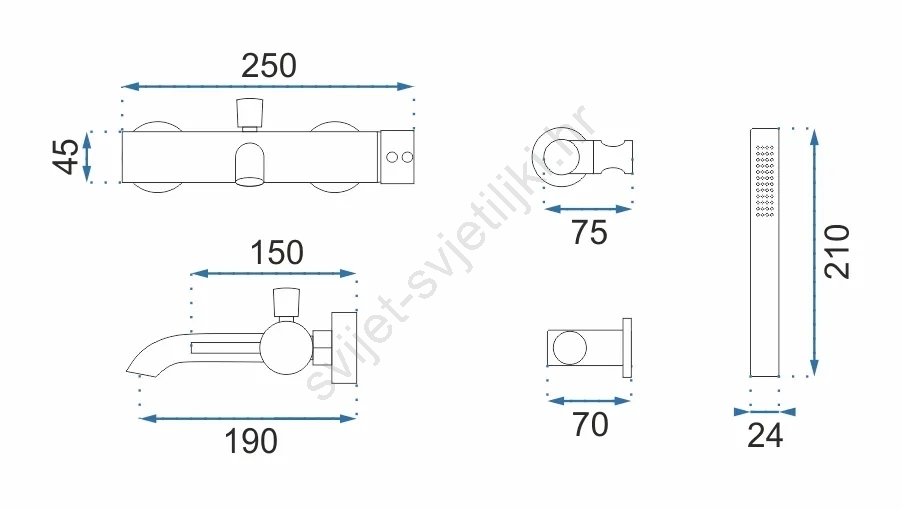 • Set sadrži: miješalicu za kadu, ručni tuš, tuš crijevo (190 mm) i držač ručnog tuša.