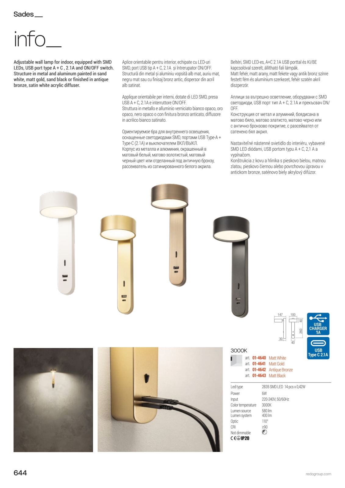 • Redo 01-4640 - LED zidna svjetiljka SADES LED/6W/230V CRI 90 USB bijela