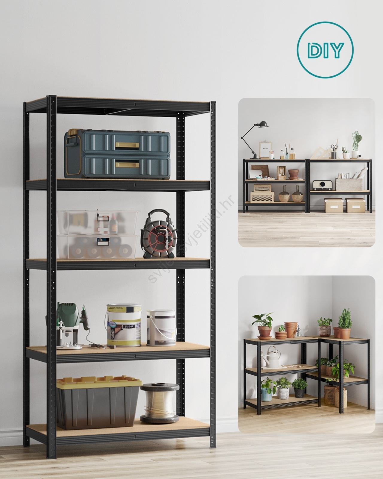 • Svaka polica nosivosti do 120 kg, sigurna za pohranu boja, alata i fitness opreme.