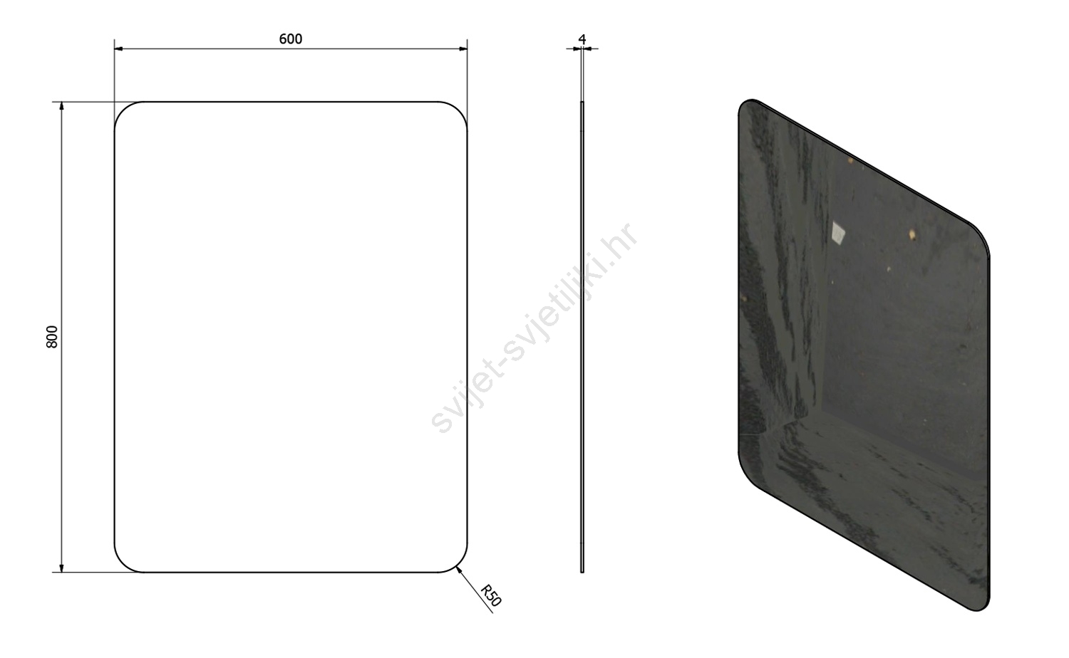 • Ogledalo ima brušeni rub i zaobljene kutove.