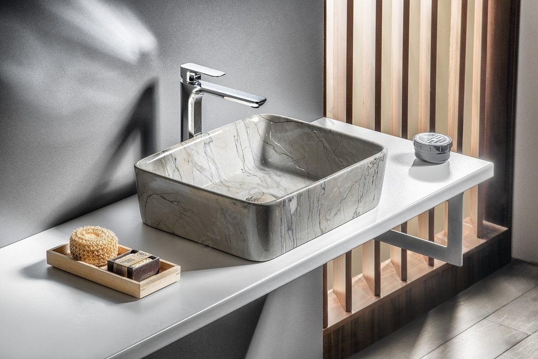 • Keramički umivaonik za postavljanje na radnu ploču s efektom kamena.