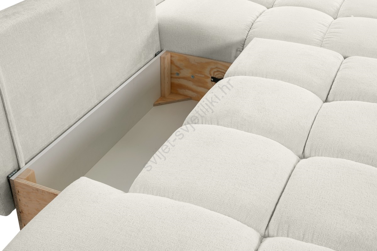 • Razvlačna lijeva kutna tapecirana sjedeća garnitura ALMADA u L-obliku, svijetlo bež, s praktičnim spremištem