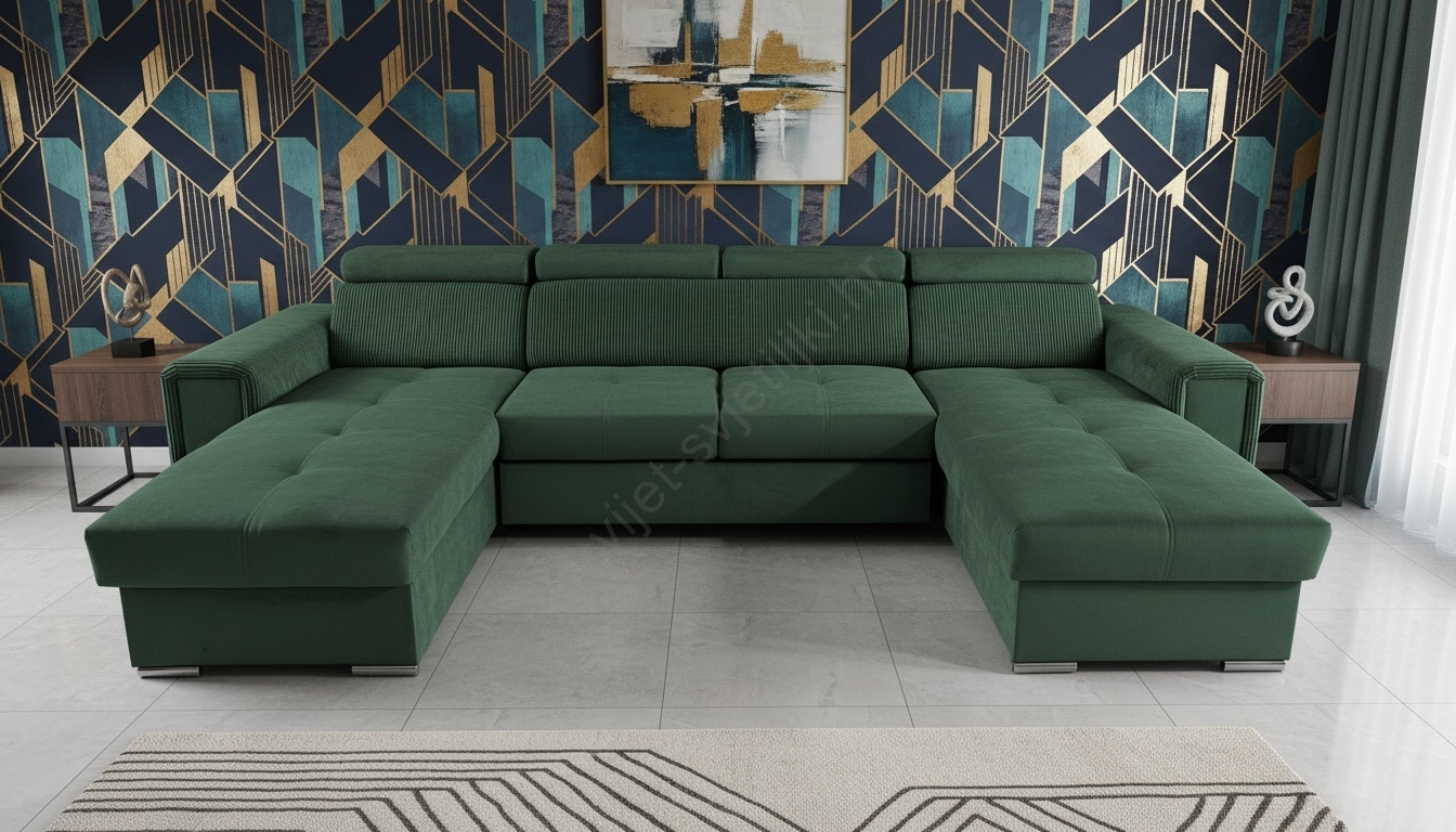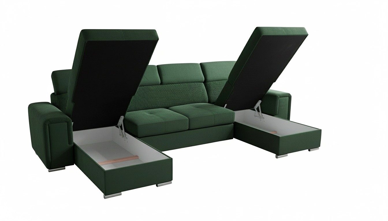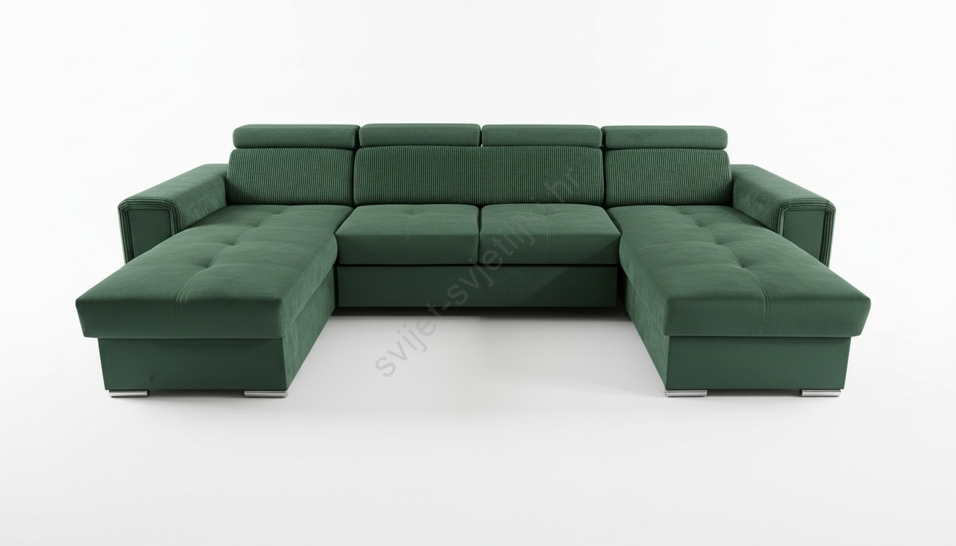 Razvlačna kutna garnitura u obliku slova U s univerzalnim kutom i spremištem SALVADA zelena