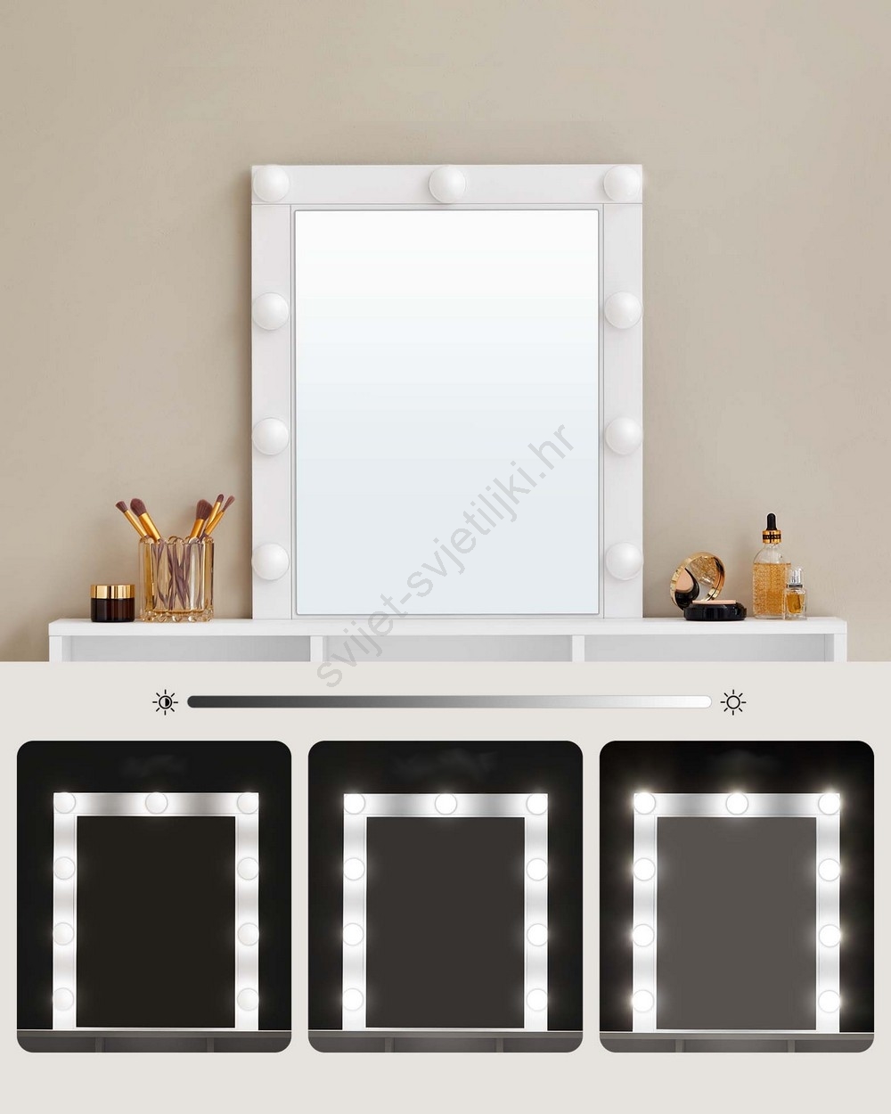 • Ima 9 prigušivih LED žarulja oko ogledala.