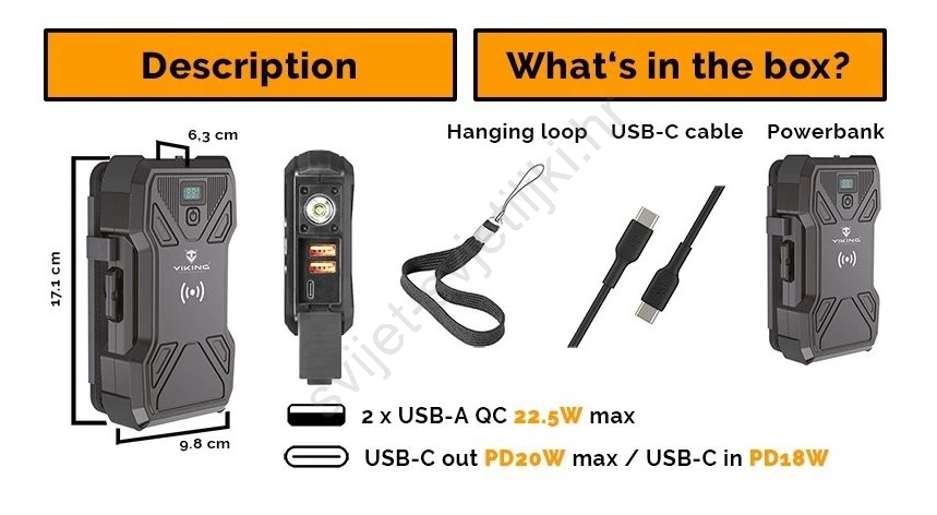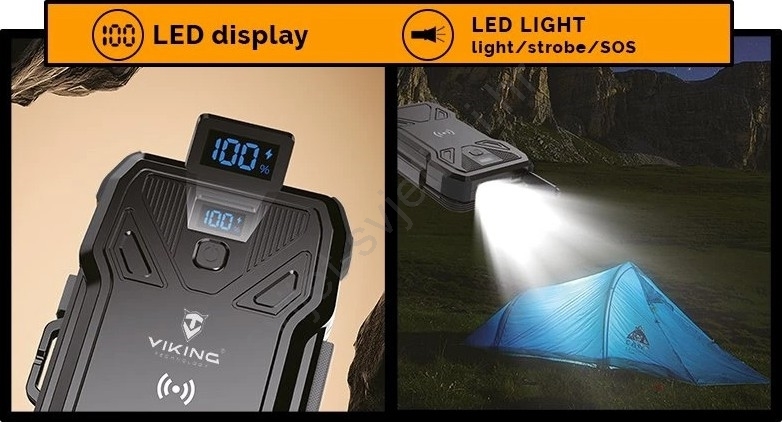 Viking - power bank s LED svjetiljkom, bežičnim punjenjem i solarnim panelom Power Delivery 22,5W/30000 mAh