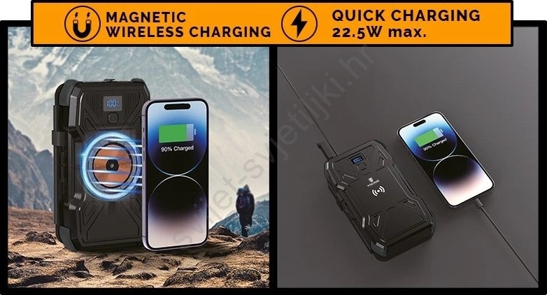 • Powerbank kapaciteta 30000 mAh, s funkcijom solarnog i bežičnog punjenja te ugrađenom LED svjetiljkom.