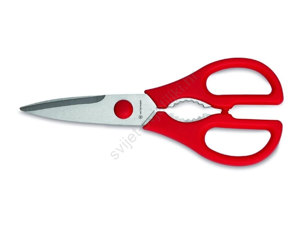 • U setu je Pull-Through oštrač za brzo i jednostavno oštrenje te višenamjenske kuhinjske škare (crvene, 21 cm).