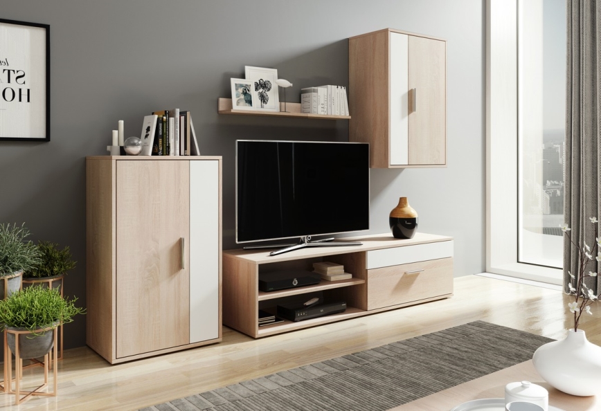 • U sastavu se nalazi prostrana televizijska komoda s otvorenim policama za multimedijalne uređaje i zatvorenim pretincima za skriveni prostor za pohranu.