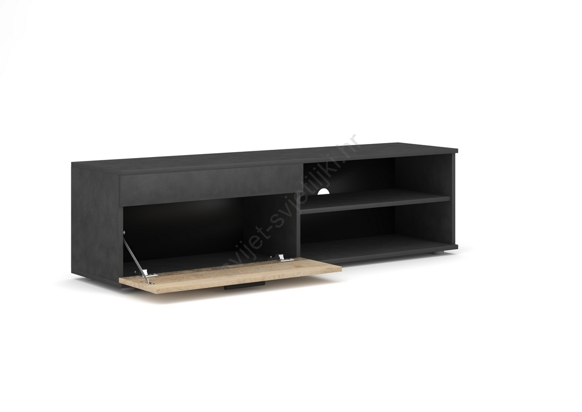 • U kompletu se nalazi prostrana TV komoda s otvorenim policama za medijske uređaje i zatvorenim pretincima za diskretno odlaganje.